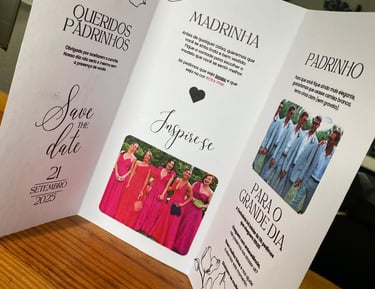 Convites, menus, tags e lembranças criados sob medida para transformar cada detalhe em algo único e inesquecível.